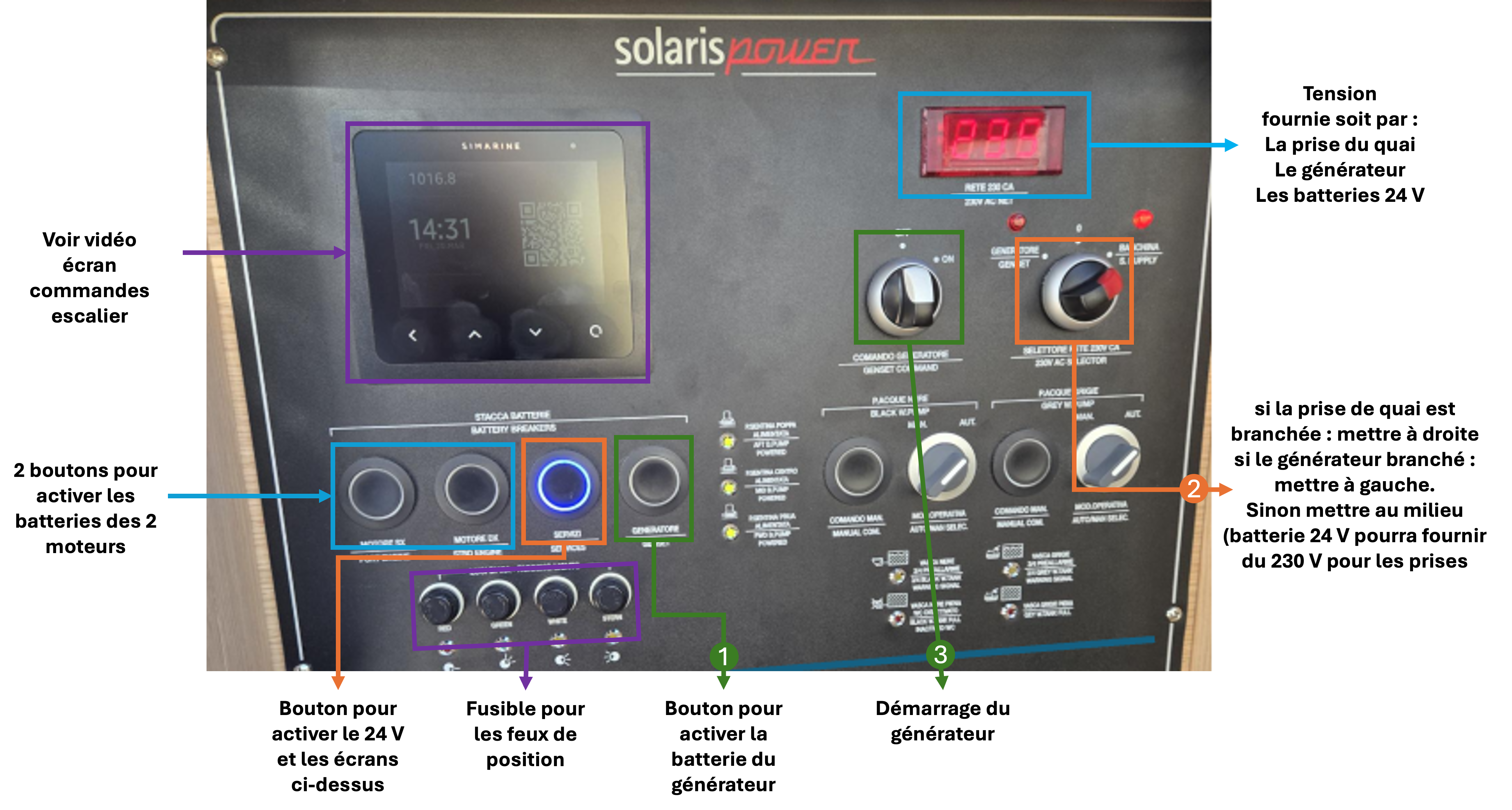 1 - Appuyer sur le bouton qui active la batterie du générateur 2 - Mettre le bouton de dessus à gauche 3 - Mettre sur on le bouton